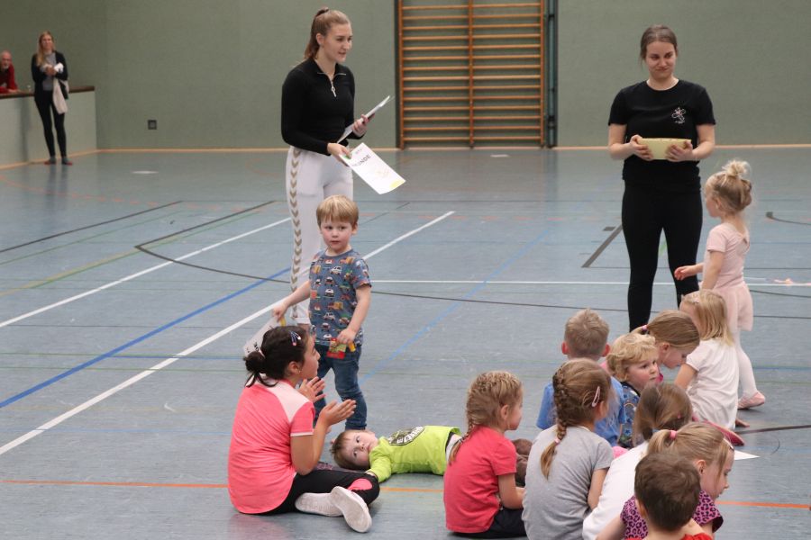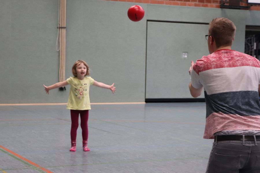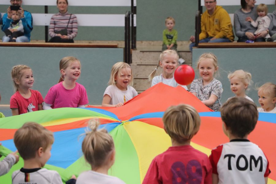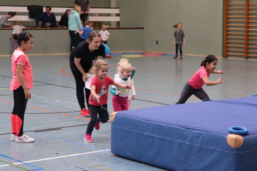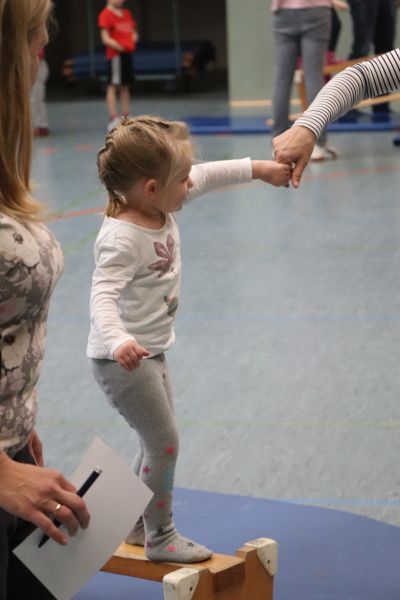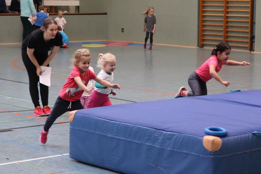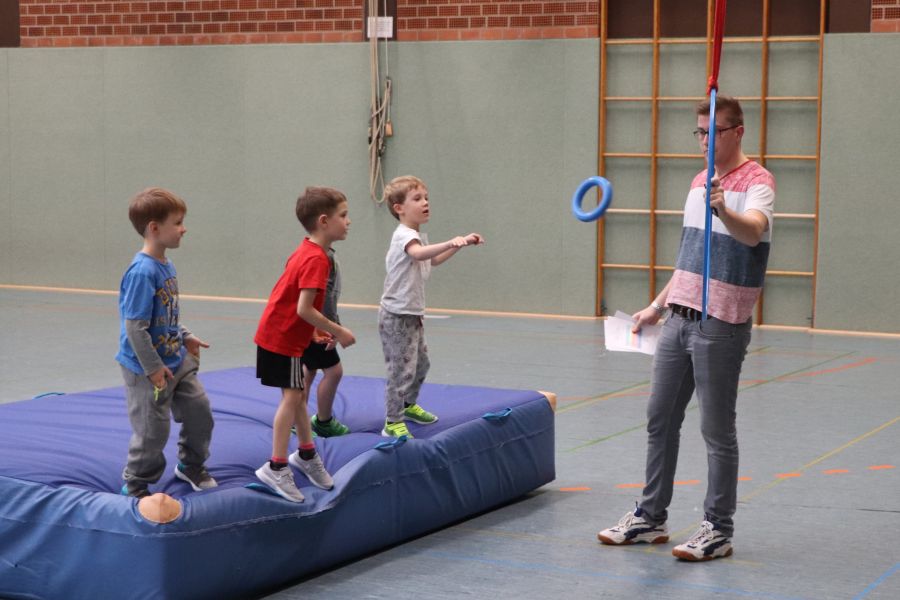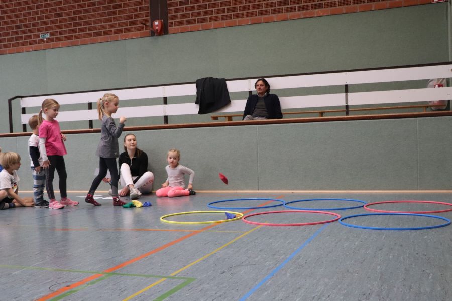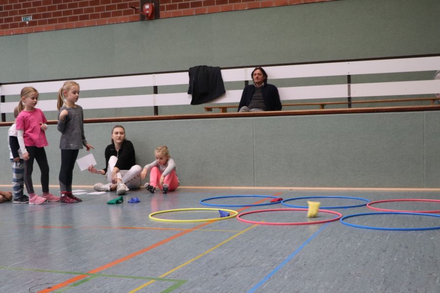 Morgens ab 8 Uhr treffen sich die Übungsleiterinnen vom Kinderturnen, angeworbene Helfer und Christina, unsere engagiere FSJlerin, in der Sporthalle. Es werden Stationen aufgebaut, Laufkarten und Urkunden bereitgelegt und weitere Vorbereitungen getroffen. Ab 9:30 Uhr füllt sich die Halle am Rudolf-Kinau-Weg mit erwartungsvollen Kindern und Eltern. Spannung liegt in der Luft, was erwartet die kleinen Sportler?