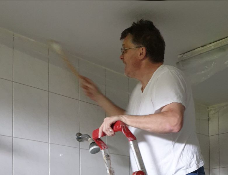 Im Duschraum der Gymnastikhalle jedoch, tut sich was. Hier wird gestrichen, damit, sobald der Sportbetrieb wieder aufgenommen werden kann, alles fertig ist.