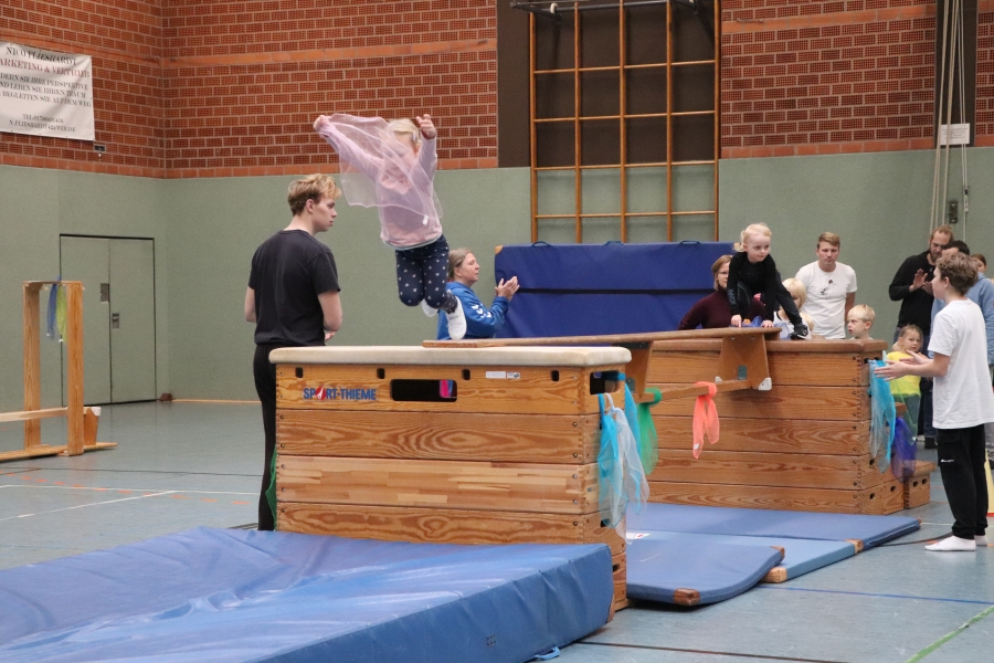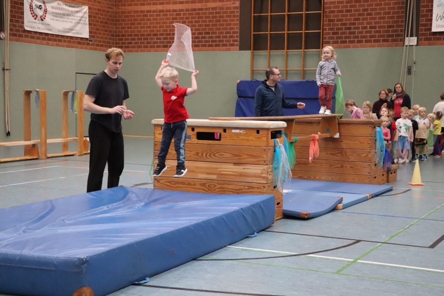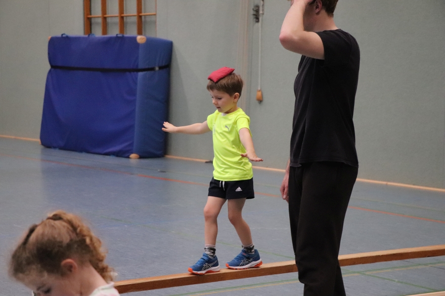 Neben Rilana fanden sich auch Laura, Jonas, Anneke, Tobi, Nadine und Petra schon morgens um kurz nach 8 Uhr für den Aufbau und die weiteren Vorbereitungen in der Halle ein. Kurze Zeit später wurden dann auch schon die ersten Kuchen geliefert und um kurz nach halb zehn konnte dann der Tag des Kinderturnens beginnen. Es wurde mit bunten Tüchern jongliert, geklettert und geturnt. Koordination war gefragt und manchmal brauchte man wohl auch etwas Mut, um über Balken zu balancieren oder vom Kasten zu springen. Am Ende gab es dann aber einen riesigen Applaus von den Eltern und alle Kinder konnten ihre Urkunde, mit der Bescheinigung als „echtes Zirkuskind“ in Empfang nehmen.
