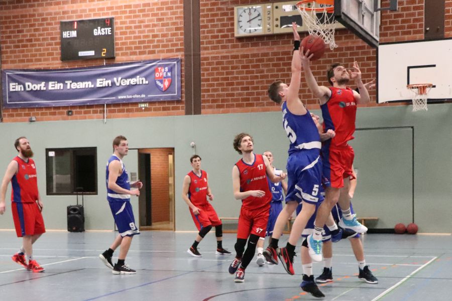 Am Sonntagnachmittag war der SV Blau-Weiß Ramsloh beim TuS Ofen in der Halle am Rudolf-Kinau-Weg zu Gast und hatte hier keinen leichten Stand. Auch nach längerer Weihnachtspause zeigten sich die Ofener wieder in Bestform. Im ersten Viertel kamen die Ramsloher kaum zum Zuge und die 49ers freuten sich über einen Stand vn 21 : 6. Mit einem Stand von 49 : 23 ging man dann in die Halbzeit. Auch im dritten Viertel hatte der Gegner keine Chance (63 :28) und so konnte sich das Team von Trainer Hendrik Heißelmann auch am 12. Spieltag über über einen Sieg (81 :42) freuen und den ersten Tabellenplatz sicher verteidigen.