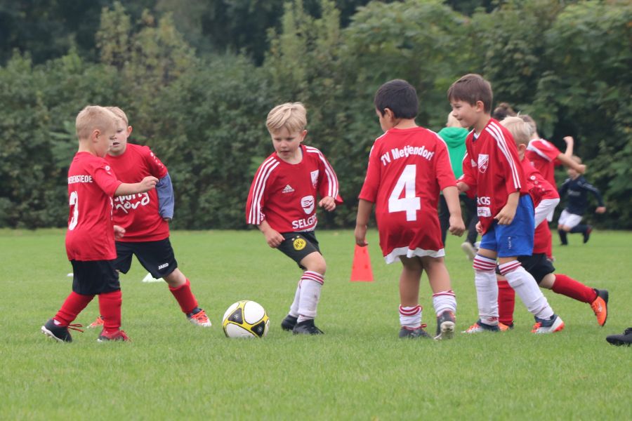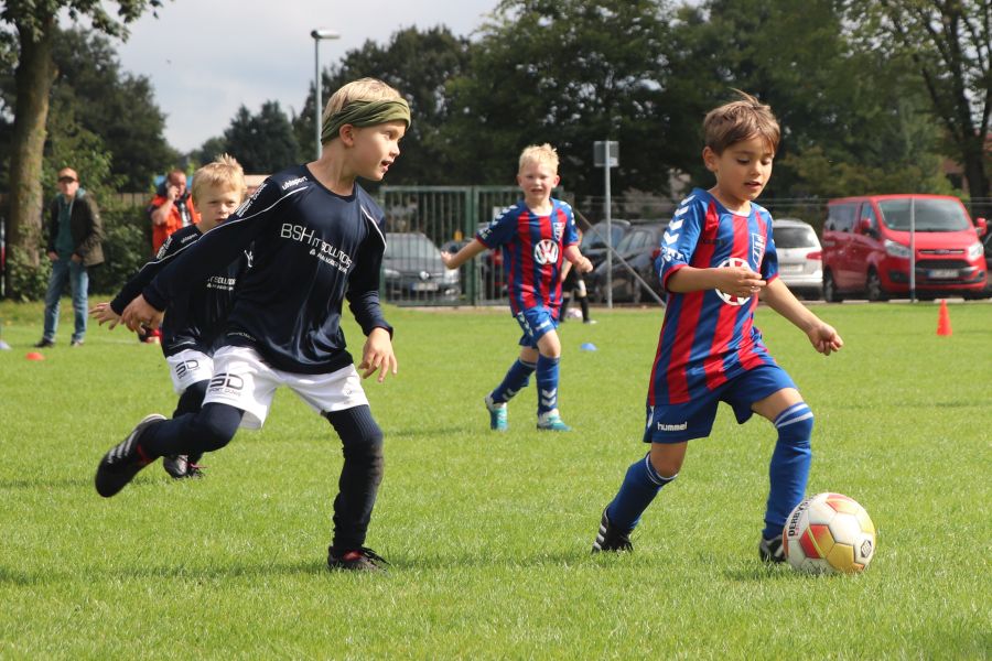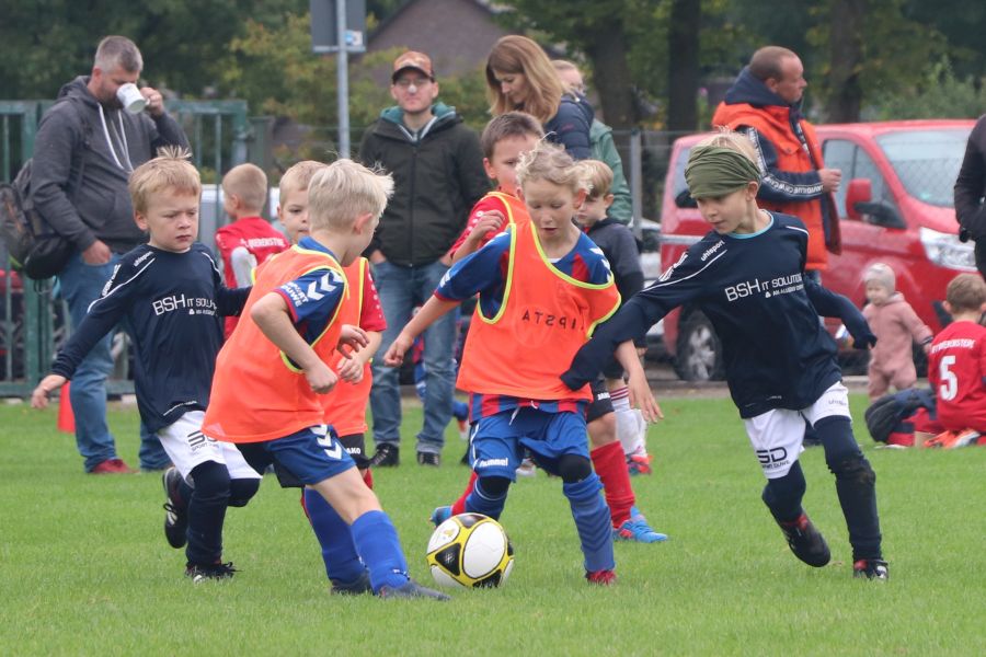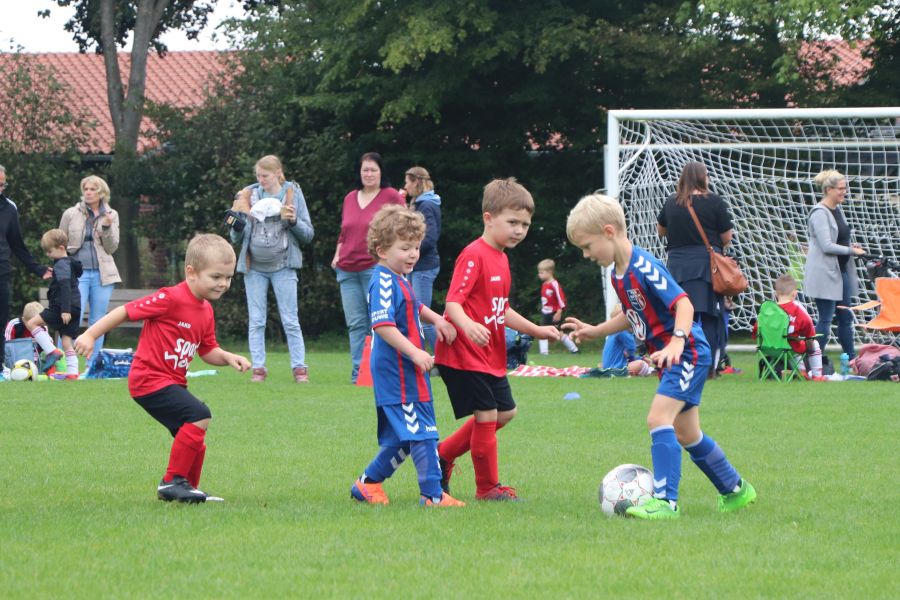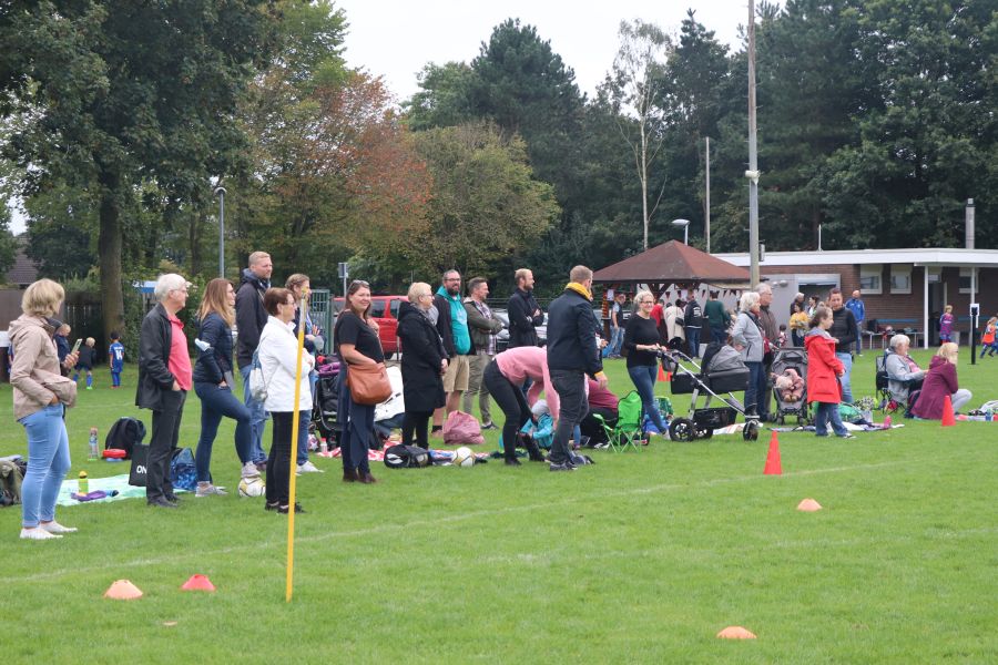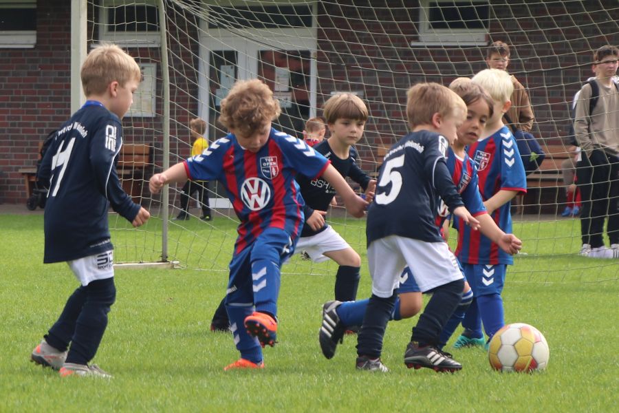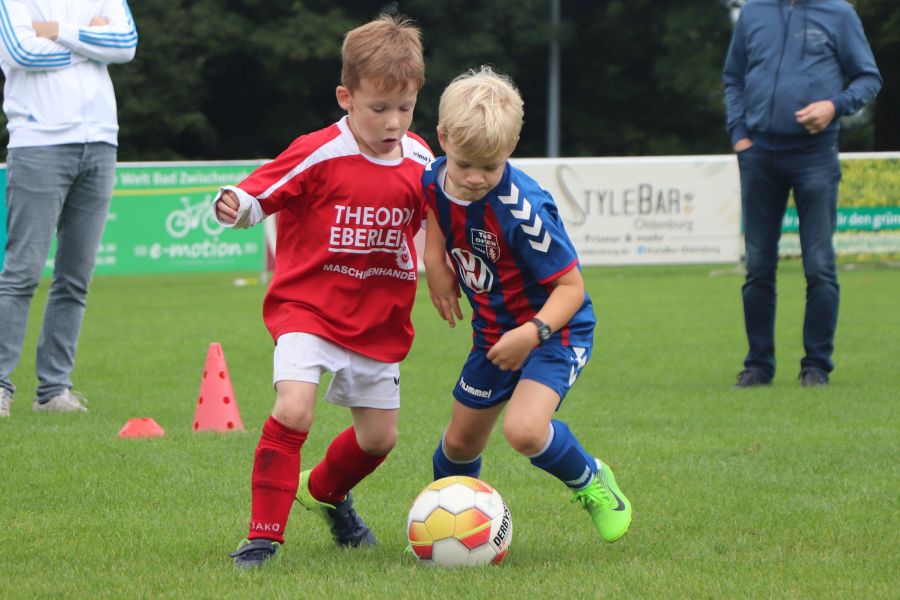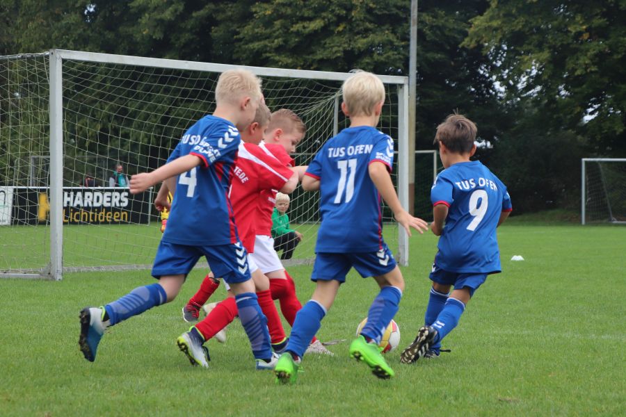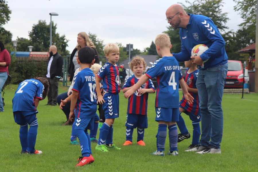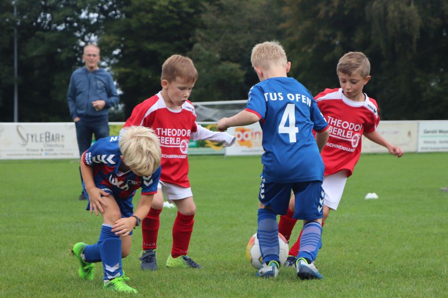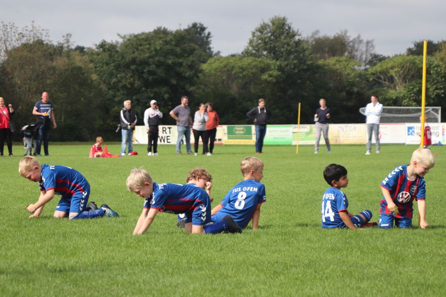 Auf dem gesamten Sportgelände des TuS Ofen herrschte am Samstag ein reges Treiben. Die Fußball G-Jugend hatte ihren Spieltag auf heimischen Boden und hier waren die Mannschaften des TV Metjendorf 1, FC Querenstede, SV Eintracht Wiefelstede und SV Eintracht Wildenloh zu Gast. Angefeuert vom Publikum am Spielfeldrand waren die jungen Spieler/innen mit großem Eifer bei der Sache.