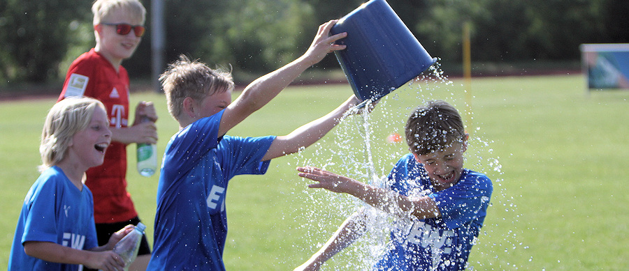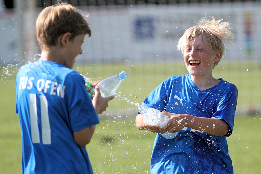 Im Anschluss wurden die zur Meisterbrause umetikettierten Wasserflaschen für die dazugehörigen „Sektduschen“ genutzt und der Rasensprenger zur Abkühlung. Ein Megaspaß, der in einer Riesenfeier endete. Die E1, E2 und F1 trafen sich mit ihren Familien zum Saisonabschluss, was auch die tolle Entwicklung beim TuS Ofen unterstreichte.
