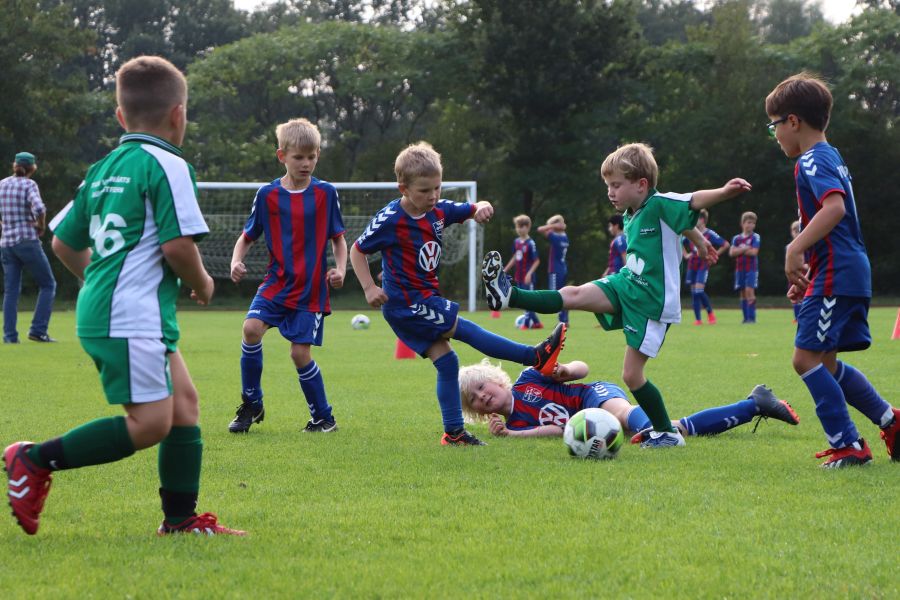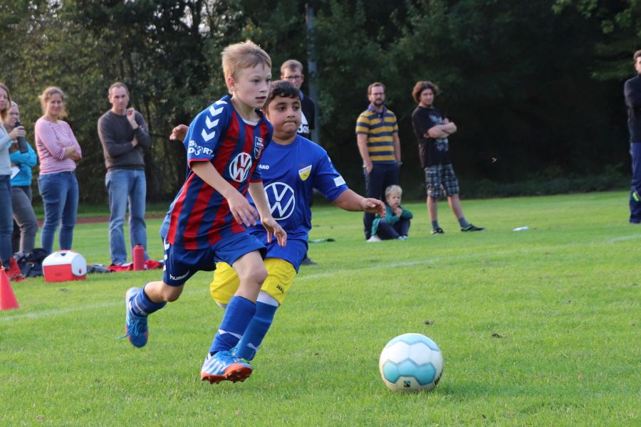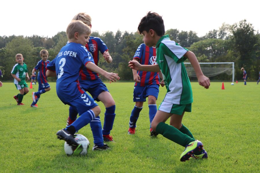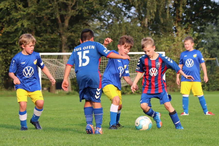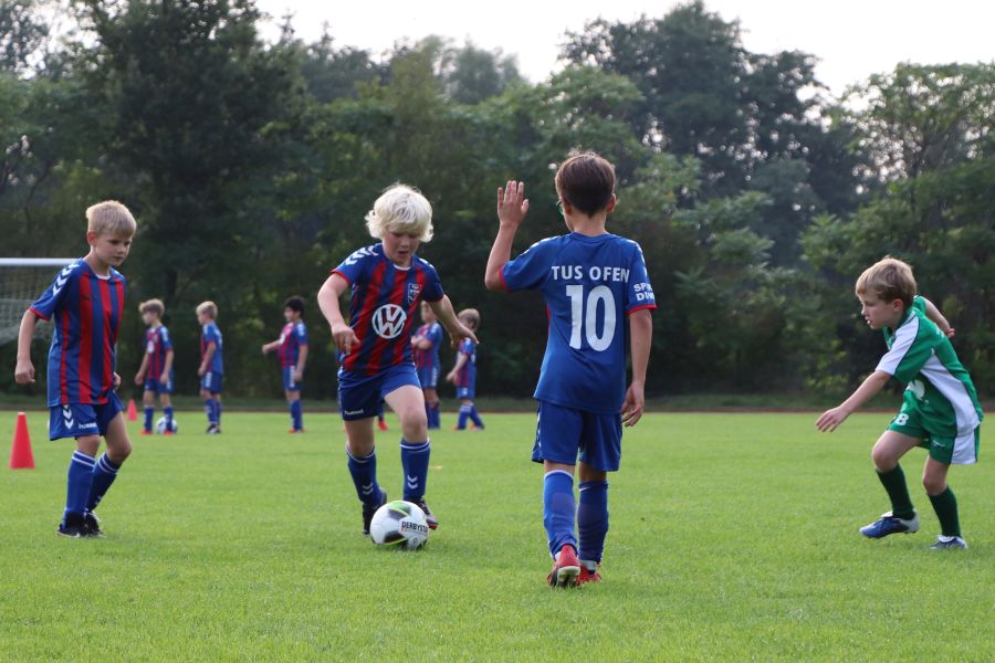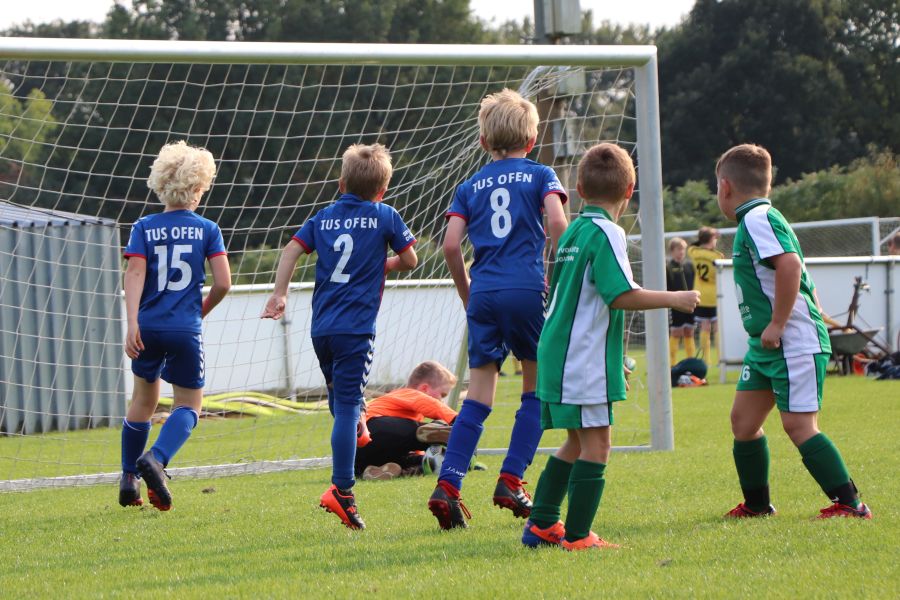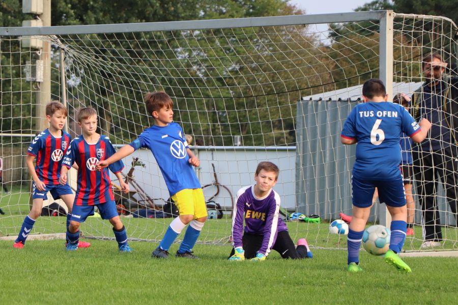 Am gestrigen Freitagnachmittag war wieder richtig was los im Sportzentrum Ofen am Rudolf-Kinau-Weg. Es gab drei hochklassige Spiele zu bestaunen. Um 17 Uhr traf die F-Jugend des TuS Ofen, die von Trainer Hergen Schütt betreut wird, auf den TuS Vorwärts Augustfehn. Nach einem etwas durchwachsenen Start, traf die Mannschaft des TuS Ofen zum ersten Mal das gegnerische Tor. Aber auch die Mannschaft aus Augustfehn gab nicht auf und so stand es zur Halbzeit 3:2 für den TuS Ofen. Dieser Spielstand freute das Team und die Fans am Spielfeldrand. In der zweiten Hälfte hat Augustfehn den Rückstand noch aufgeholt und so stand es am Ende des Spiels 6:6. Trotz des Remis war die Mannschaft von Trainer Hergen Schütt sehr erfreut.