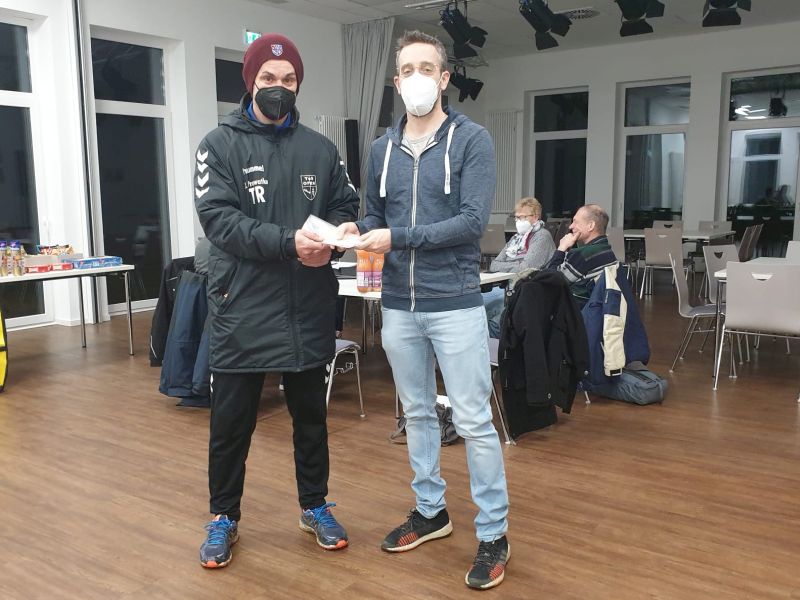 Somit passte es gut, dass Coach Prawatke auch schnell wieder auf den Platz wollte. Dennoch nutze er ein paar Minuten um den Anwesenden die besten Grüsse vom Team TUSO1 zu überbringen. In diesem Zuge konnte Jens an Stephan Meinecke, vertretend für das Organisationsteam der Ofener Vereine, eine Bargeldspende übergeben werden.
