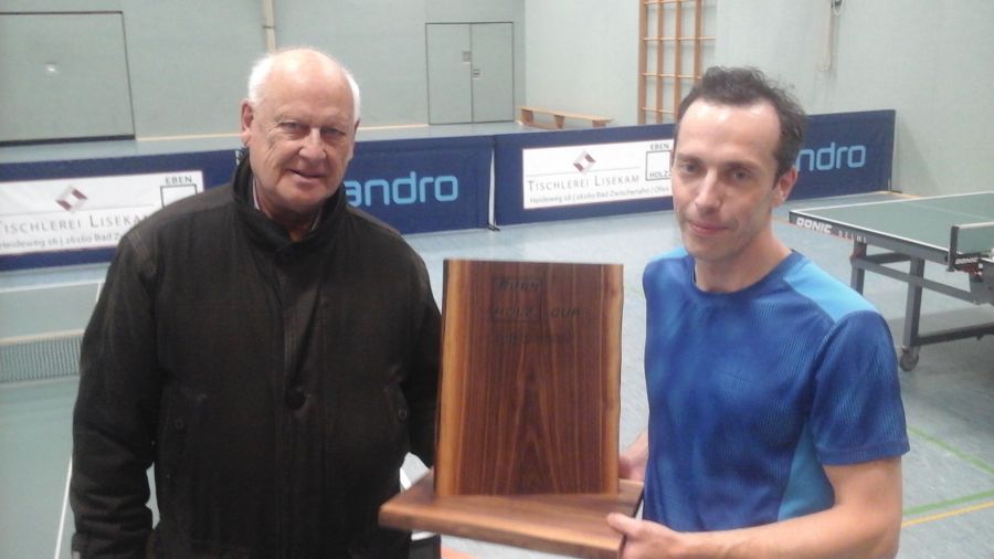 Mathias Diecks erhielt aus der Hand von Hero Eiben den Siegerpokal. Er war, wie es sich für den Ebenholz-Cup gehört, „eben“ aus Holz.