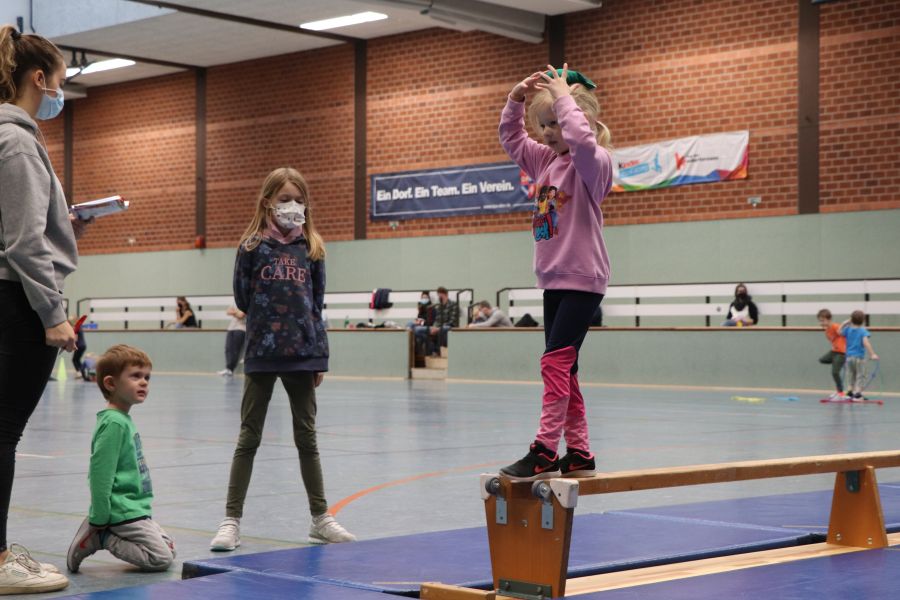 Die von den kleinen Turnern und Turnerinnen zu bewältigenden Aufgaben betrafen überiegend den Bereich Koordination. Im Vordergrund stand jedoch Spaß und Bewegung und so konnten dann auch alle 30 Kinder nach einem Abschlusstanz stolz ihre Urkunden in Empfang nehmen.