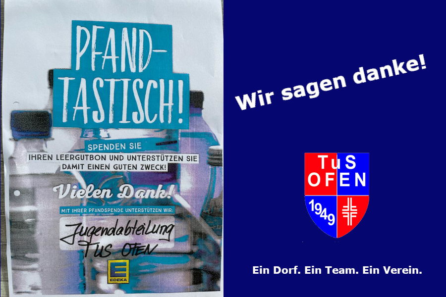 Wir bedanken uns ganz herzlich bei der Firma Edeka Böse und natürlich bei allen Kunden, die auf ihr Pfandgeld verzichtet und stattdessen den TuS Ofen bei dieser Aktion bedacht haben. Wir freuen uns, das Geld für Anschaffungen im Jugendbereich einsetzen zu können.